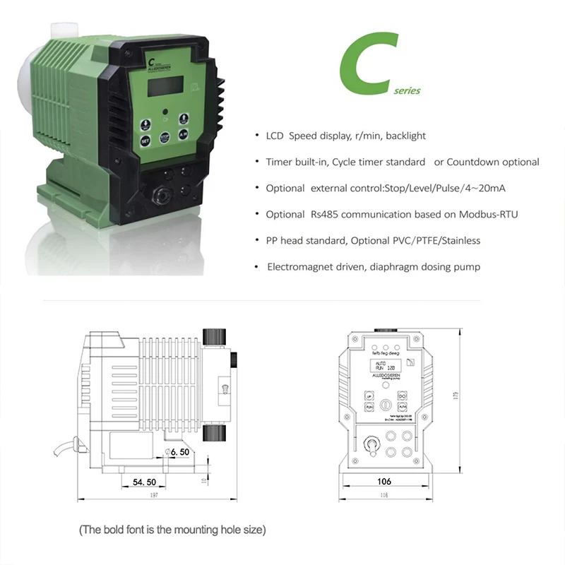 The dosing pump is a microprocessor-controlled, short-stroke, solenoid-driven, diaphragm-type dosing pump for metering liquid,non-combustible media. It is popular to our customer for its precise design, reliable operation, good performance-cost ratio ,with a good anti-corrosion performance of the liquid ends.